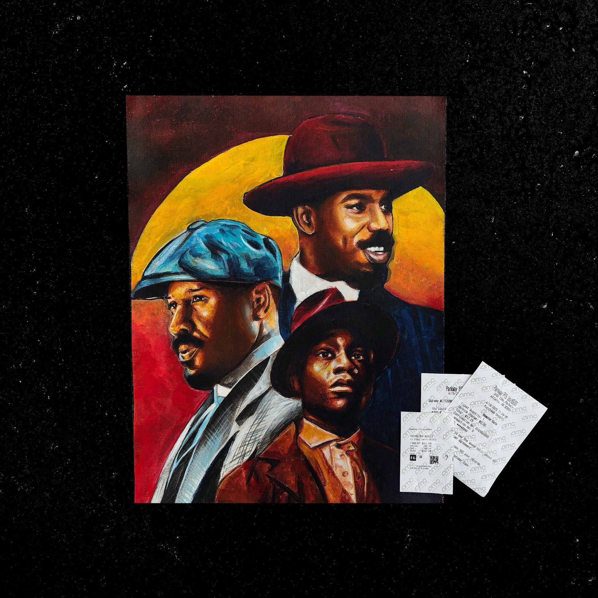 This is a 1-of-1 original painting, created with acrylic on 12x16 inch unstretched canvas. Best displayed framed, this piece is monumental — completed within the first seven days of the film’s release. With Sinners receiving a rare 100% rating on IMDb, this artwork holds historic value. It would make a powerful and collectible addition next to your movie ticket or memorabilia, marking a moment in film and art history.